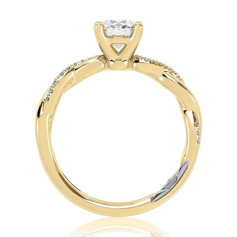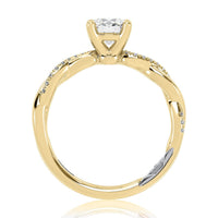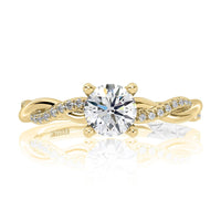 Elevate your love story with our Twisted Shank Diamond Engagement Ring. This contemporary masterpiece features a dazzling 14 Karat yellow gold band adorned with a brilliant R Cubic Zirconium center stone. The cross-over four-prong design showcases 25 exquisite 0.10Tw round G Si1 diamonds, symbolizing eternal commitment. A true embodiment of timeless elegance.