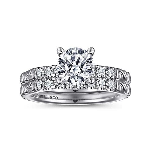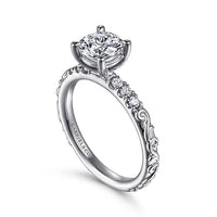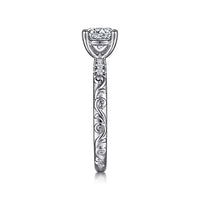 This contemporary round cut engagement ring achieves a look of understated elegance. Crafted from 14K white gold, the straight shank is garnished with 0.14cts of diamonds along the shoulders and graceful swirls descending down each side. Versatile for layering with other rings, this simple ring is a timeless beauty.