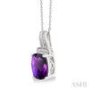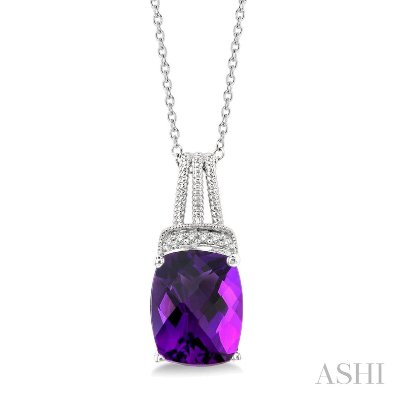 A stunning semi-precious pendant, this draws attention to the Amethyst that highlights the beauty of the pendant. Whether it is being bought for gifting purposes or to add to one's own jewelry collection, this pendant makes a great addition. It features a 10x8MM cushion cut Amethyst that accents the cushion shape center mount, which extends at the top, before attaching to the triple rope bar loop holder. The mount extension is embellished with 6 pave set round cut diamonds. A 1.00MM cable chain comes included with the pendant, both of which are framed in silver. Total diamond weight is 1/50 ctw.