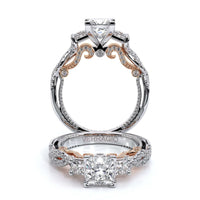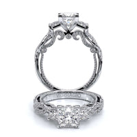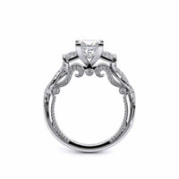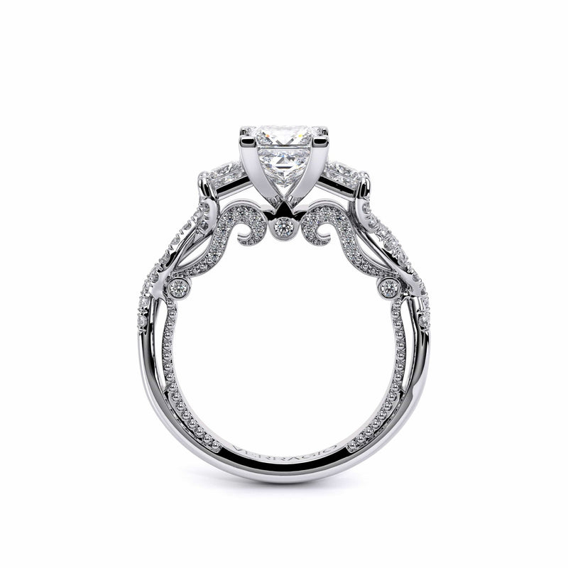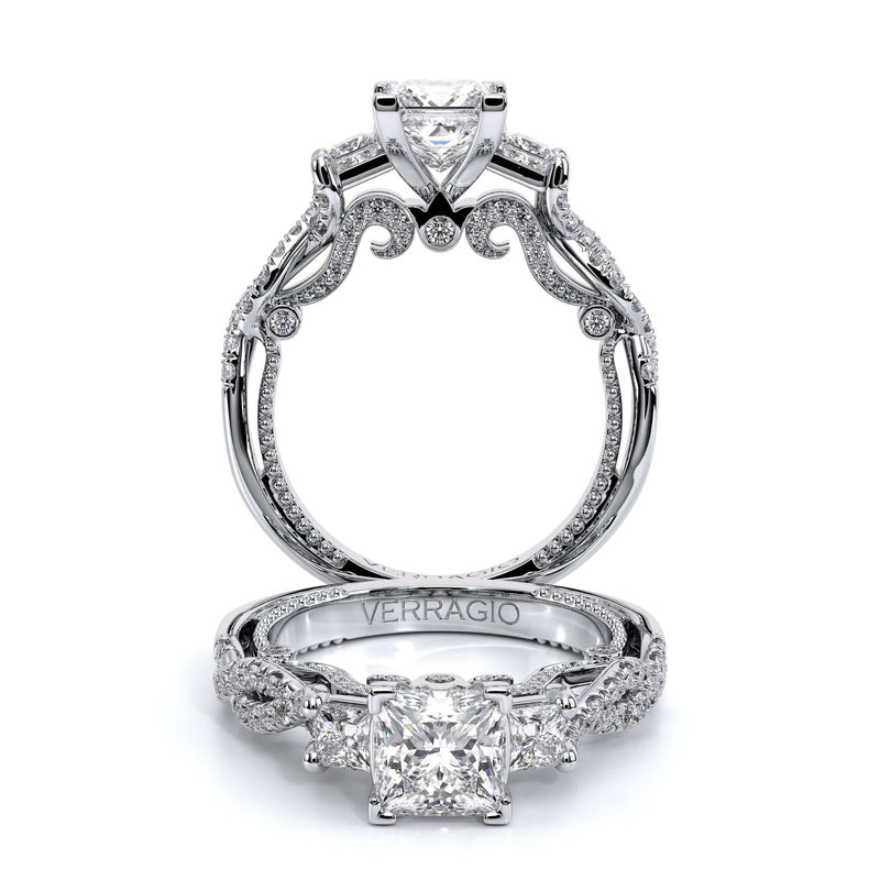 INSIGNIA-7074P Three stone diamond engagement ring adorned with Verragio's signature beading, pave set brilliant-cut diamonds on Insignia's handcrafted scrollwork and twisted band. Refined to enhance a Princess diamond center.