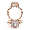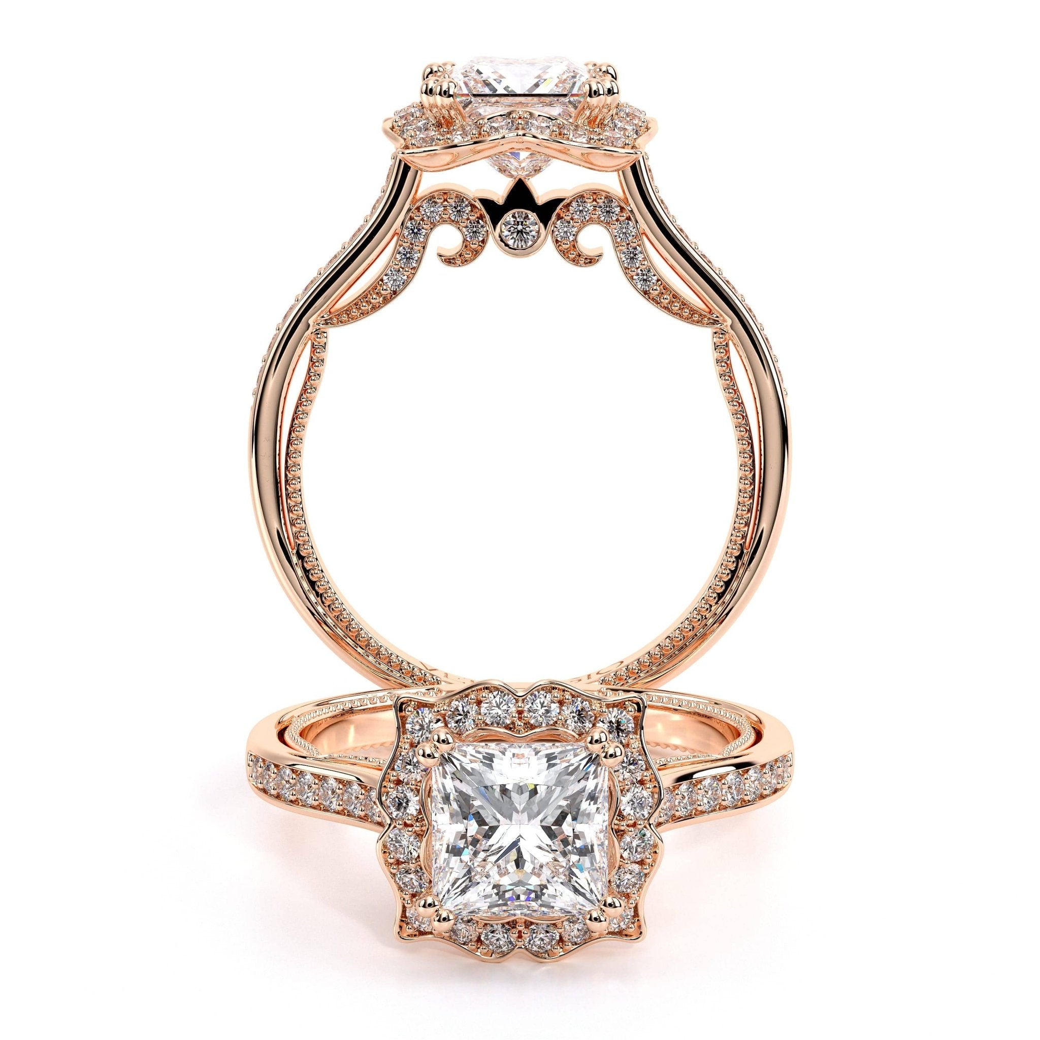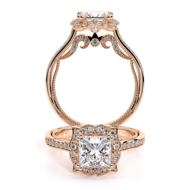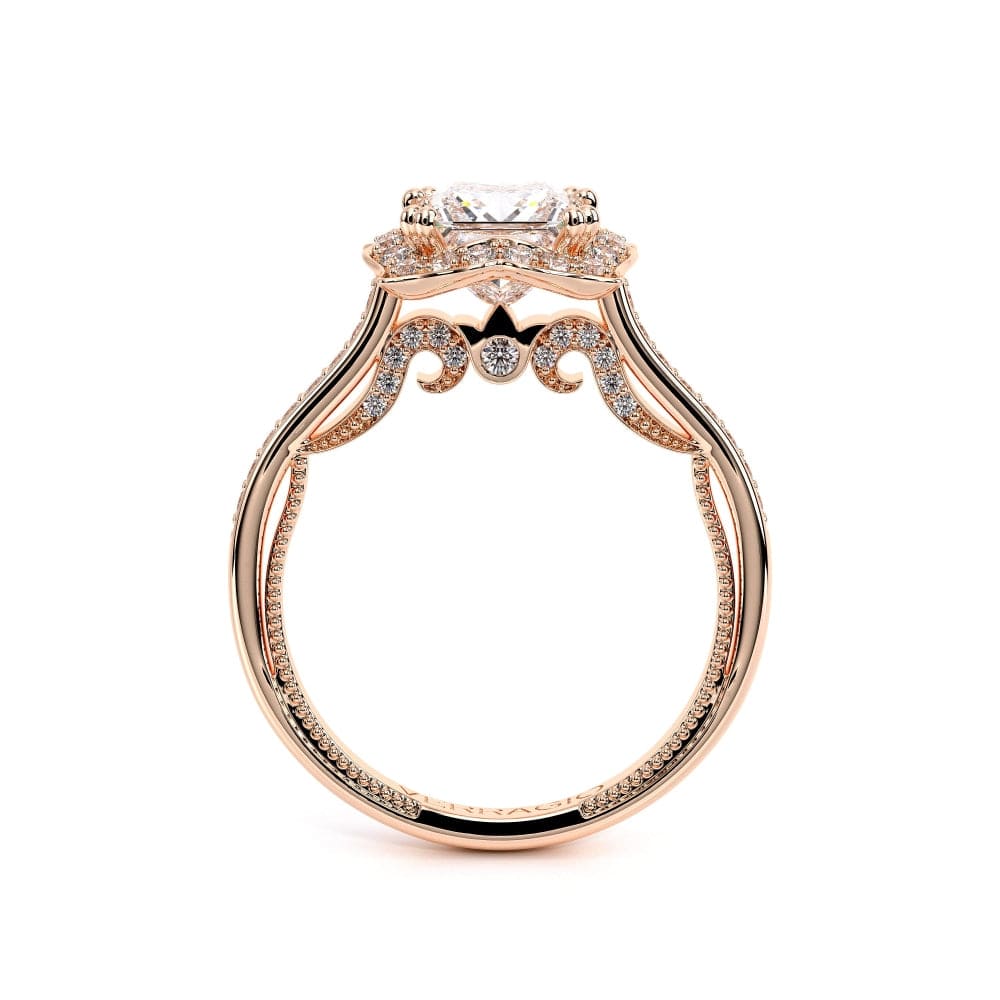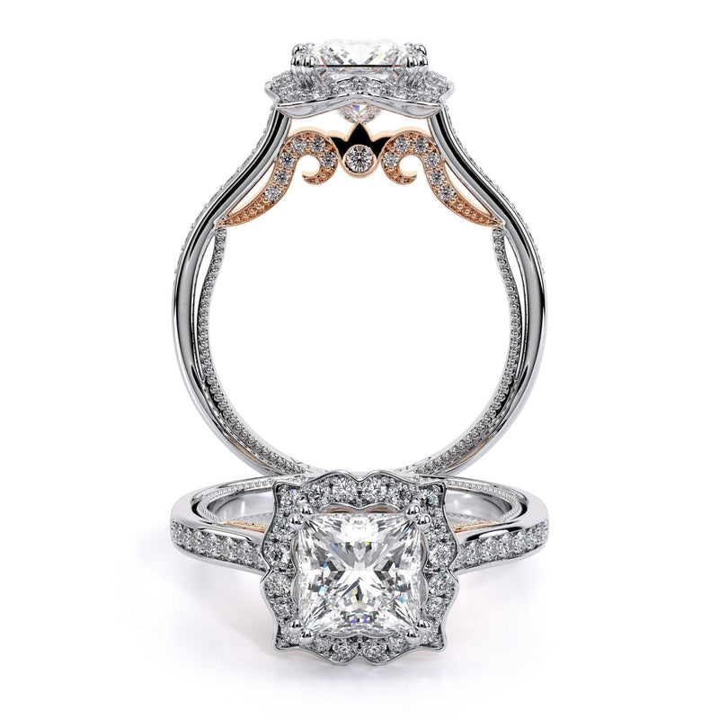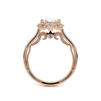 NSIGNIA-7092P is our vintage engagement ring which showcases a handcrafted Victorian halo designed to enhance your round center stone. Adorned with meticulously set round brilliant-cut diamonds amid Insignia's distinctive diamond scrollwork, Verragio's timeless signature beading and crest.