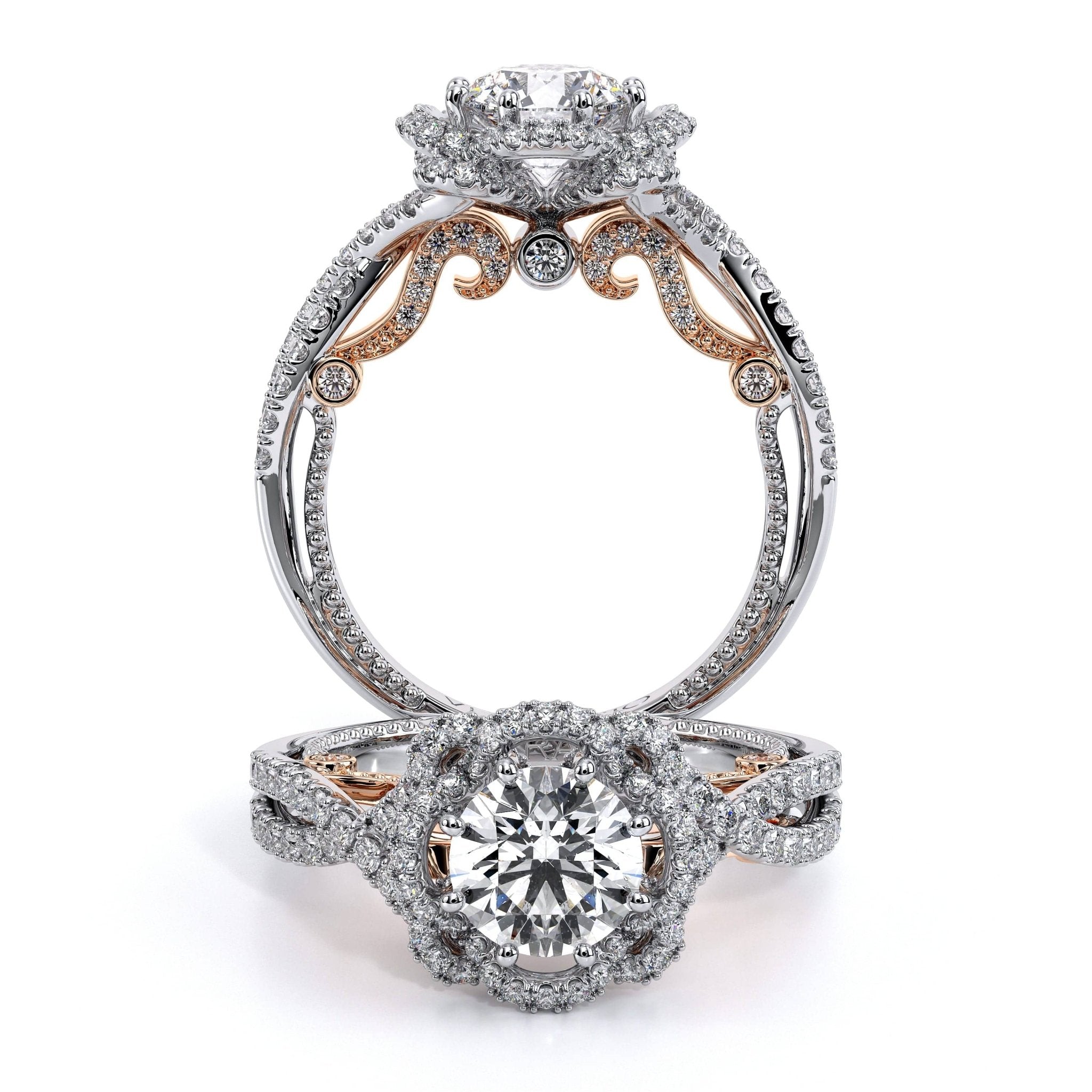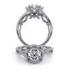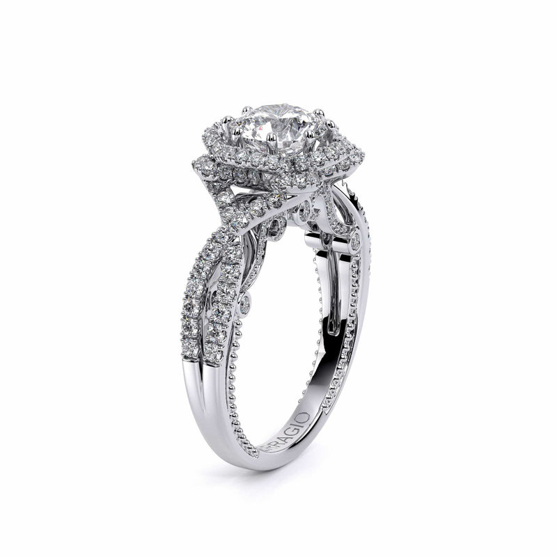 INSIGNIA-7087R Featuring, Verragio's uniquely designed handcrafted floret halo that is adorned with meticulously set round pave brilliant-cut diamonds on a twisted band. Encompassed by Insignia's handcrafted diamond scrollwork and Verragio's signature beading to enhance a Round diamond center.