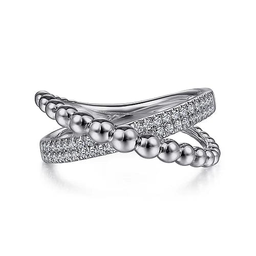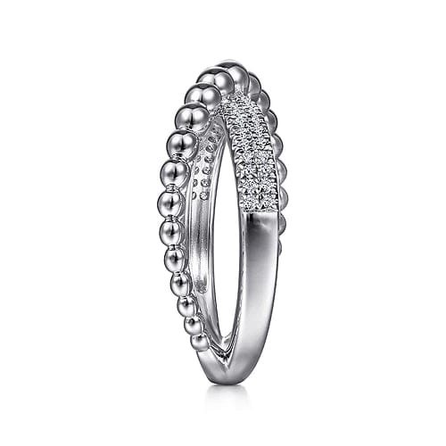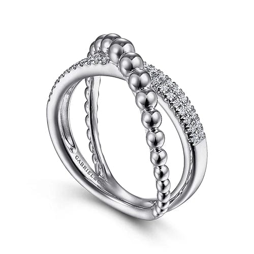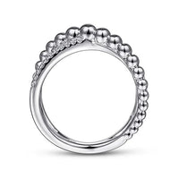 A criss-cross design gives this layered Bujukan ring a compelling X shape. Crafted from 925 sterling silver, it showcases a ribbon of scintillating pavé white sapphires layered diagonally beneath a band of graduated silver spheres. Bring modern sophistication to your digits with this silver and white sapphire ring.