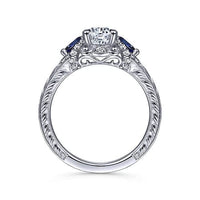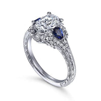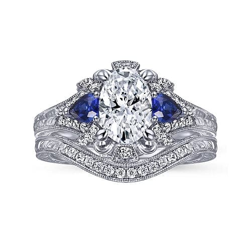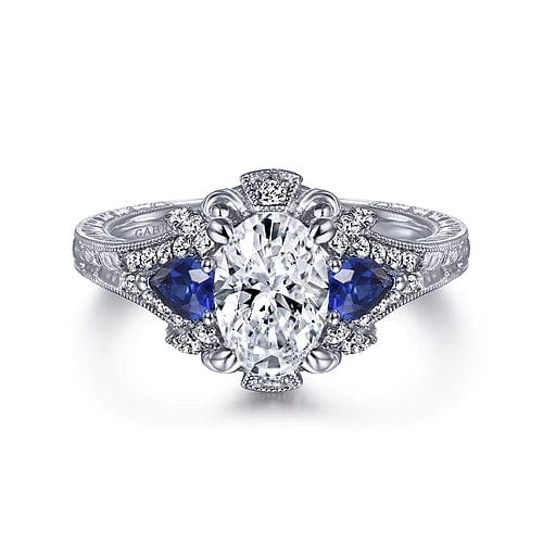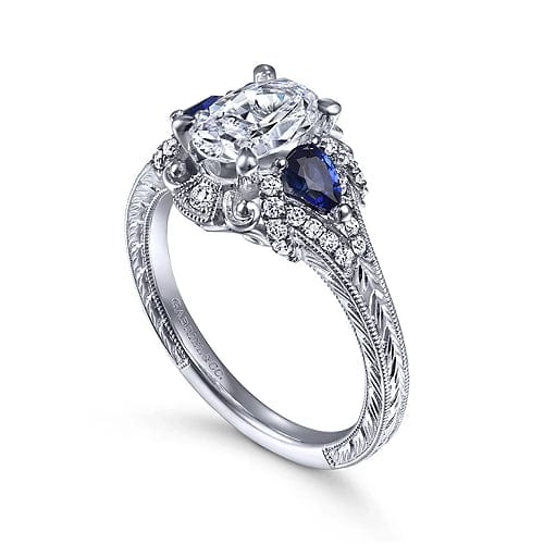This antique-style oval engagement ring is richly detailed, from the hand-engraved shank to the flourishes in the gallery. Two velvety blue sapphire side stones in a contrasting pear shape are joined by glistening 0.21ct accent diamonds to create a coveted 3 stone halo silhouette. Crafted from 14K white gold, this setting boasts a colorful vintage vibe.