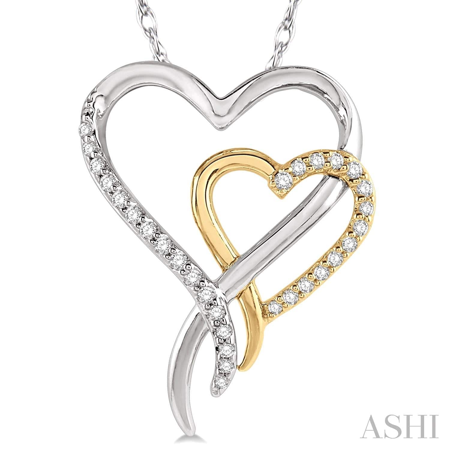 An eye-catching interlocked heart pendant with diamond highlights makes up this pretty necklace. It showcases a large white gold heart interlocking a smaller yellow gold heart. While the yellow gold heart has a curved out extended tip, the tip of the larger heart crosses over, extending into open ended curved-in tips. Both hearts are half embellished with pave set round cut diamonds, a total of 30. The other half is plain gold. An MR5 18-inch rope chain comes with the pendant and is styled in 10 karat white gold, while the latter is framed in 10 karat white and yellow gold. Total diamond weight is 1/10 ctw.
