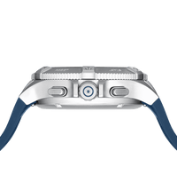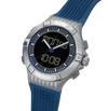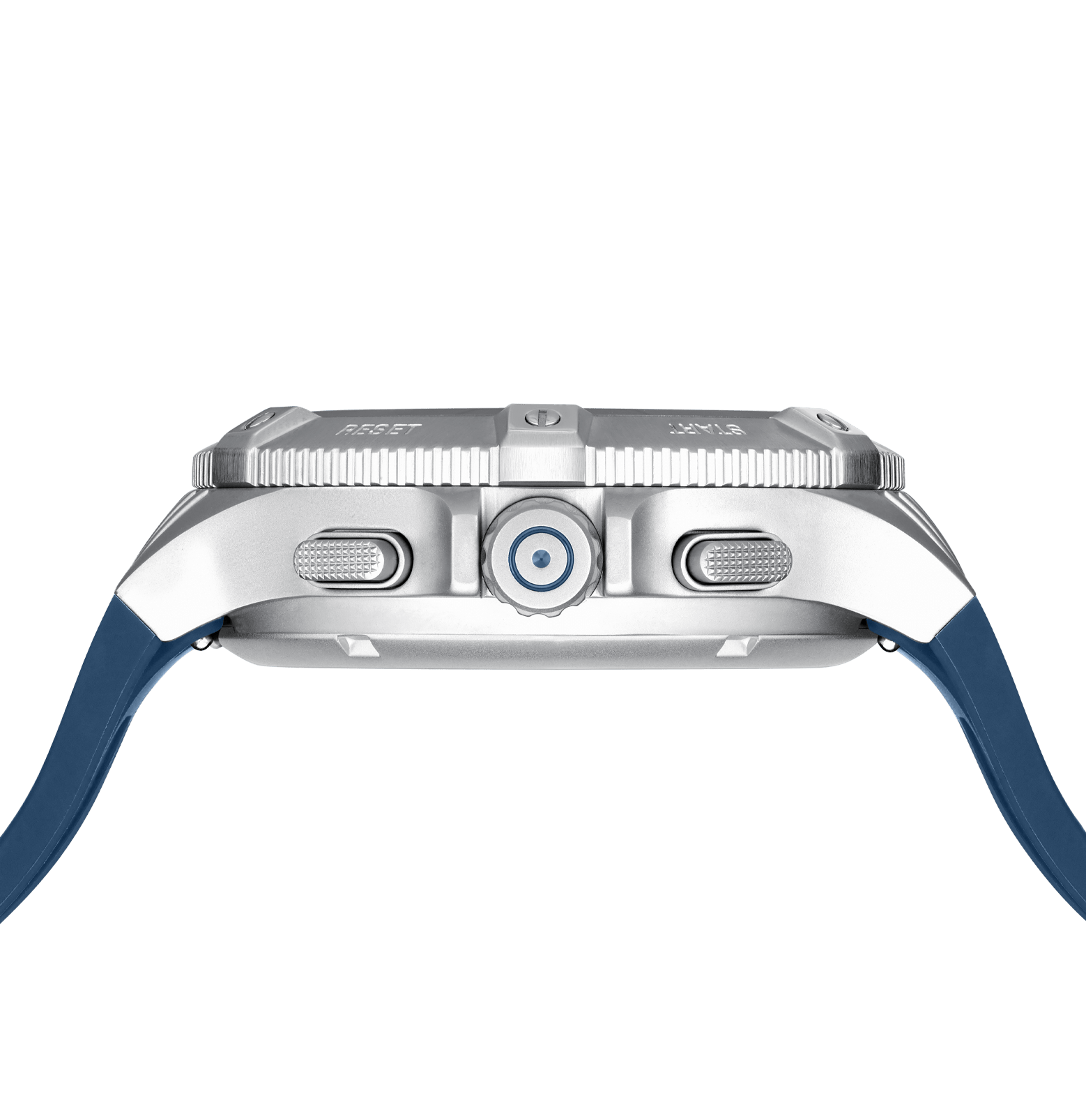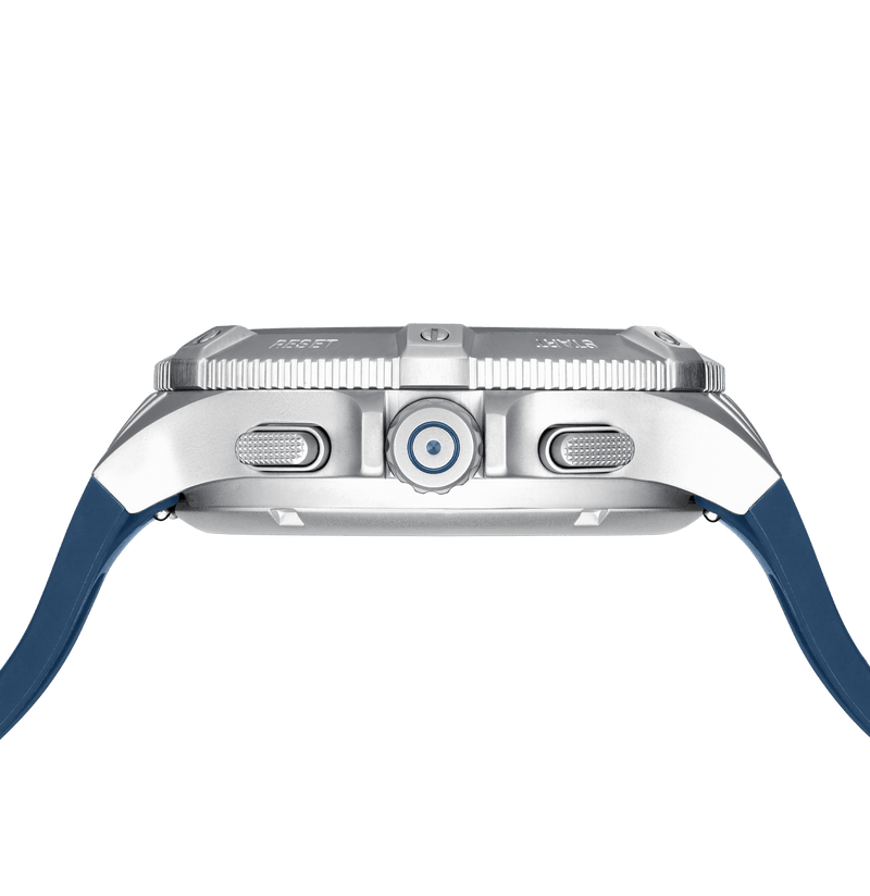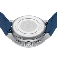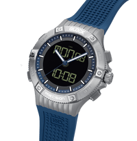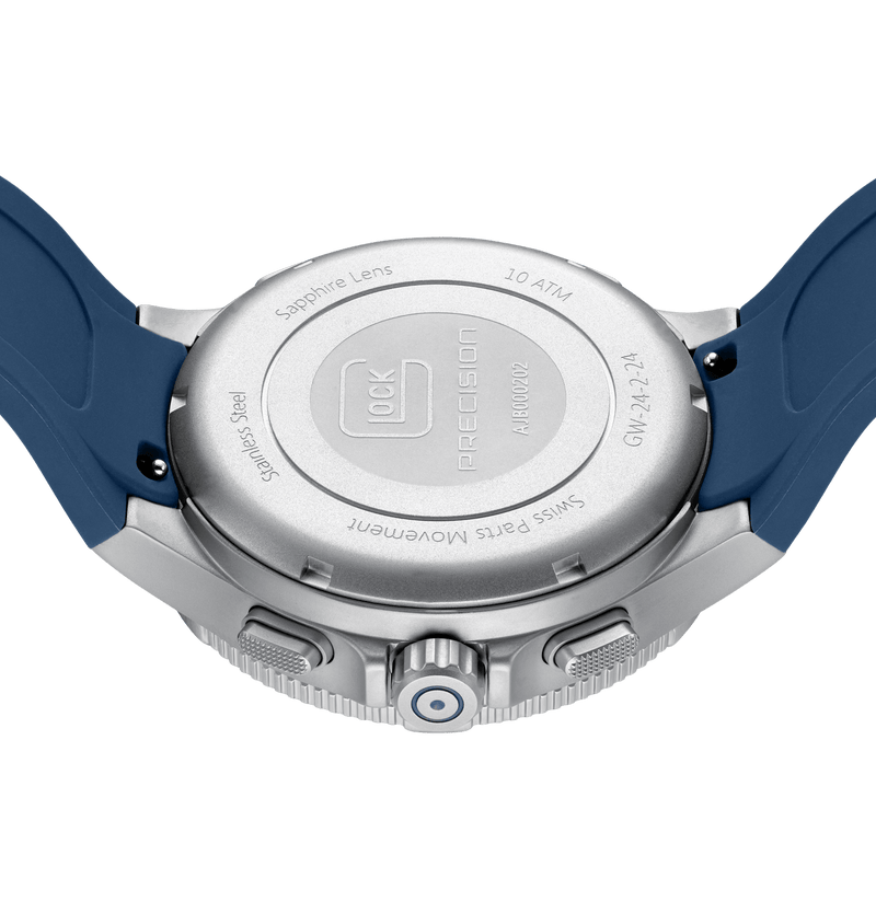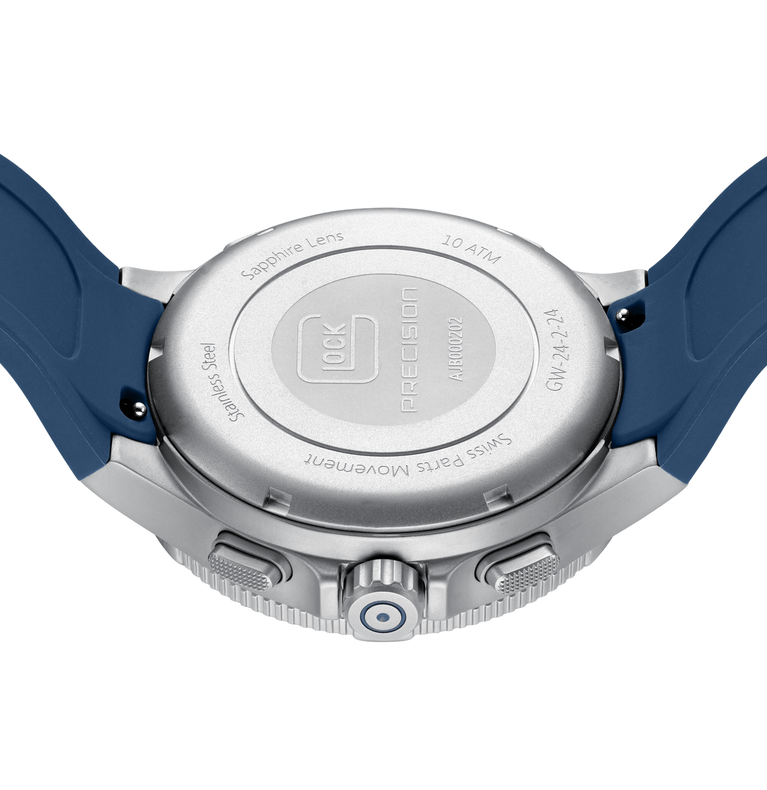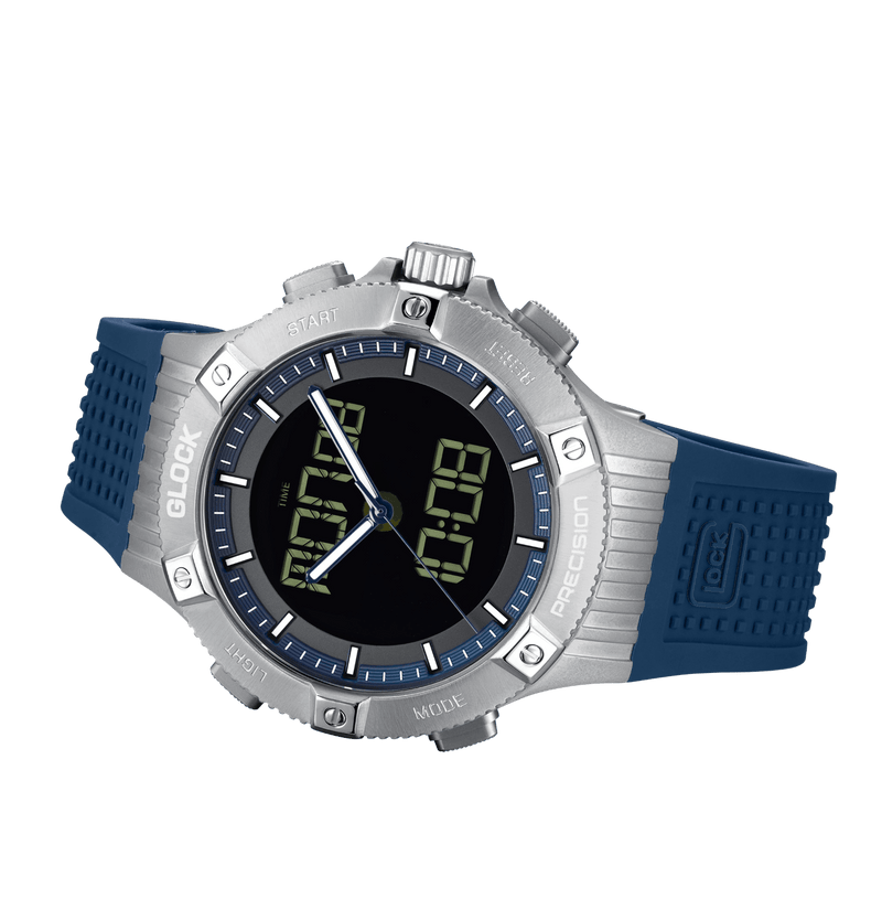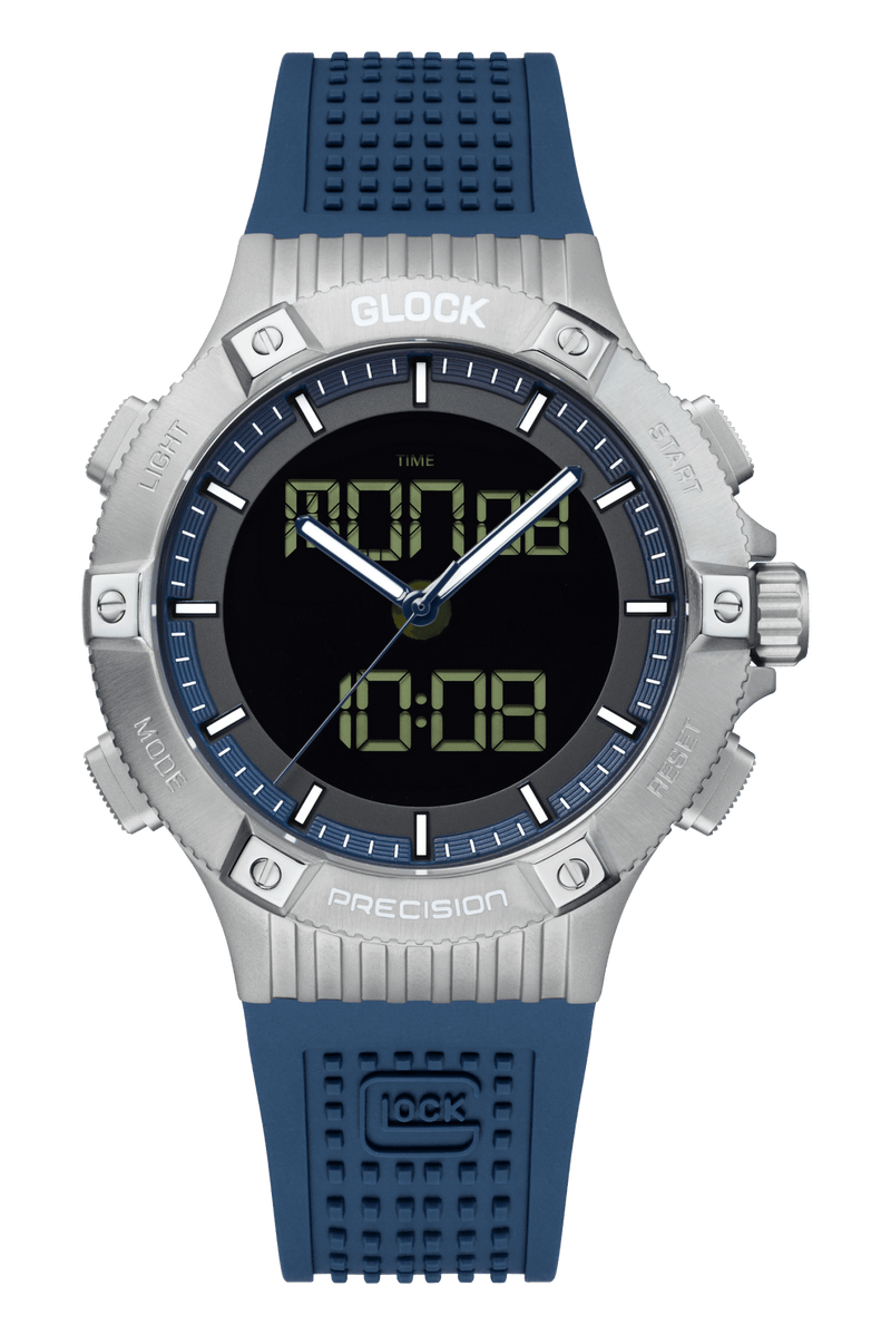 This watch represents modern elegance. Its sandblasted stainless steel case is paired with a vibrant blue silicone strap featuring GLOCK's RTF texture. The combination of an analog and digital time display, complemented by Swiss Super-LumiNova® hands and indices, ensures a precise and quick check of the time. With a chronograph function and a 10 ATM water-resistance rating, it blends reliability with style.