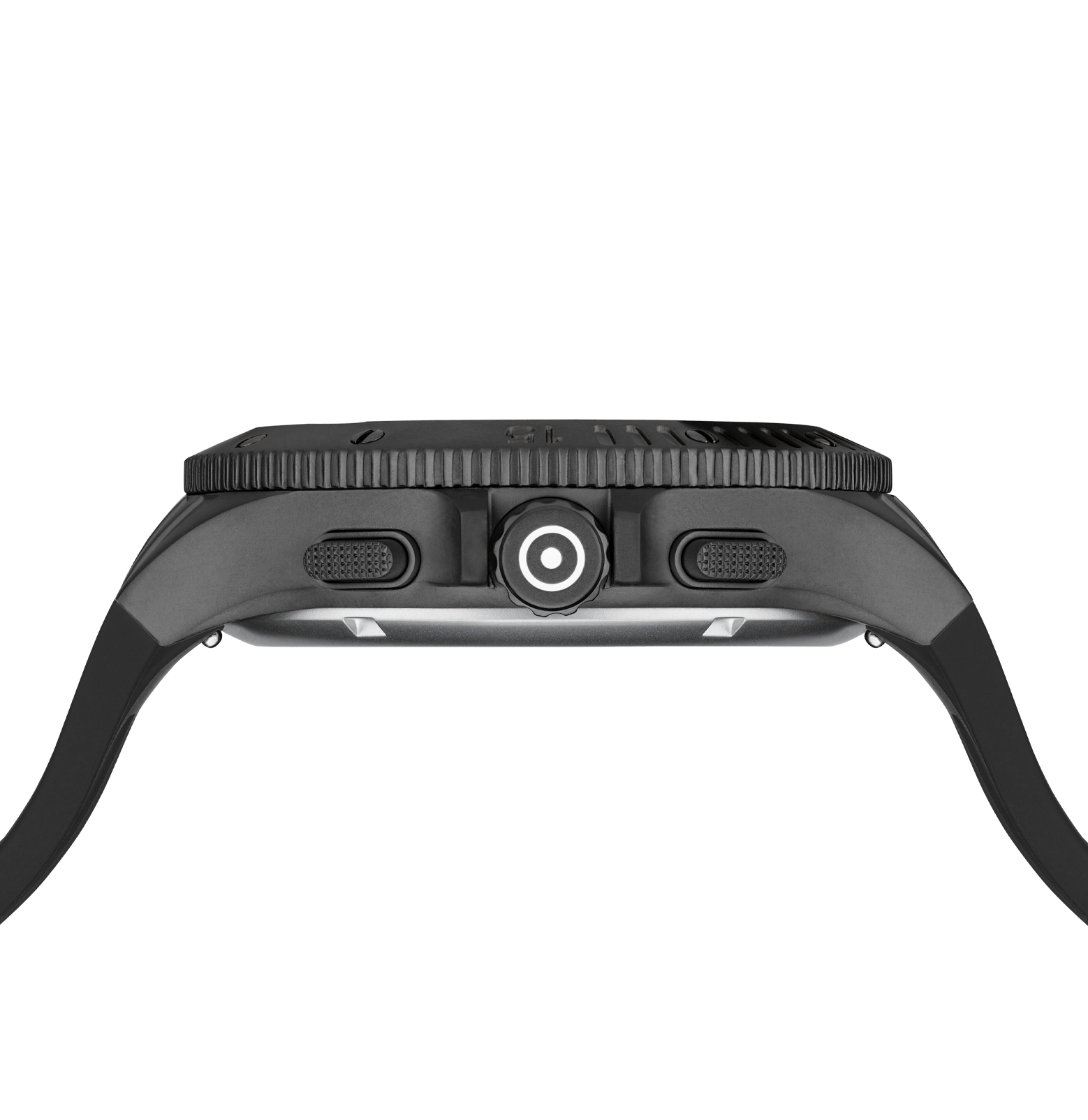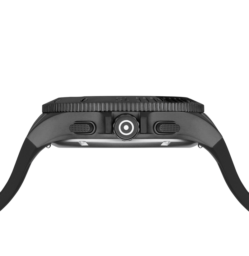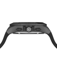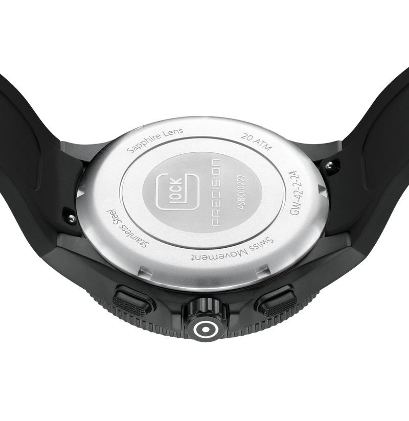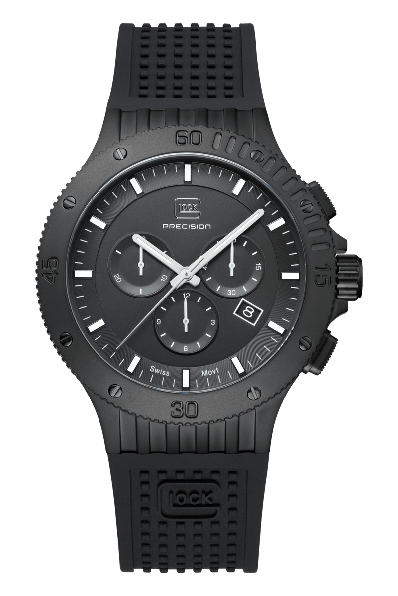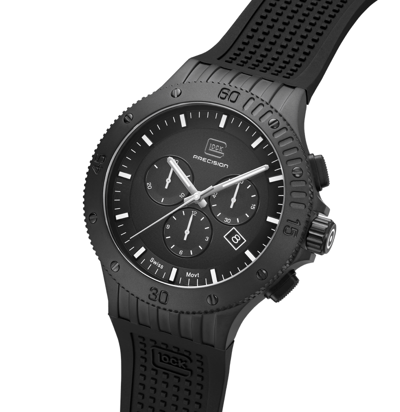 This watch combines precision and style. Its elegant black stainless steel case complements the matching silicone strap with GLOCK's RTF texture. The black dial, accentuated by silver-tone hands and indices with Swiss Super-LumiNova®, is protected by resilient sapphire crystal. Powered by a Swiss movement, it guarantees reliability and accuracy. Accompanied by a chronograph and a 20 ATM water-resistance rating, this timepiece is certain to be a versatile companion for adventures.