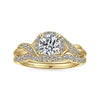 The band of this romantic engagement ring features braided strands of smooth and pave diamond encrusted yellow gold. A round halo completes the design.