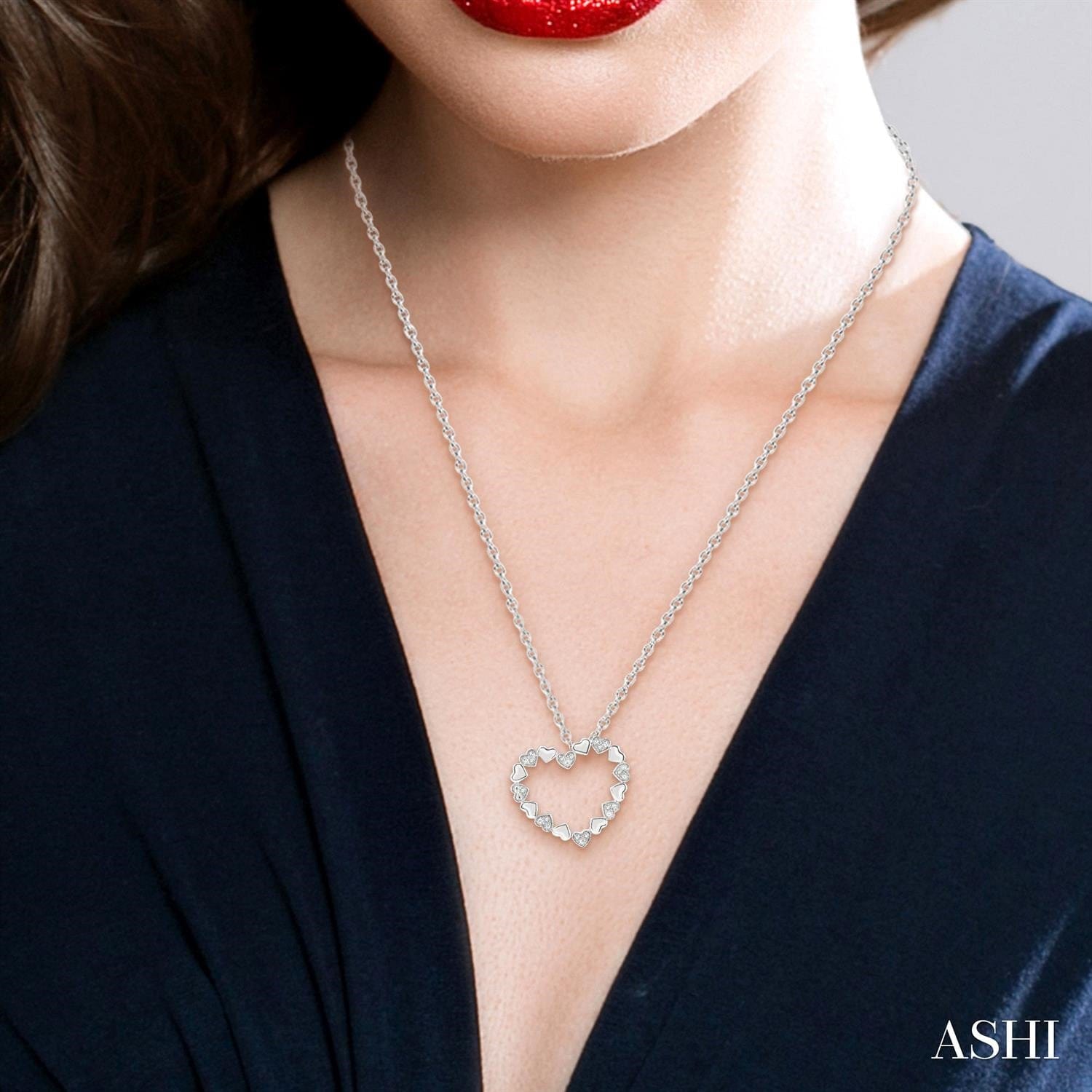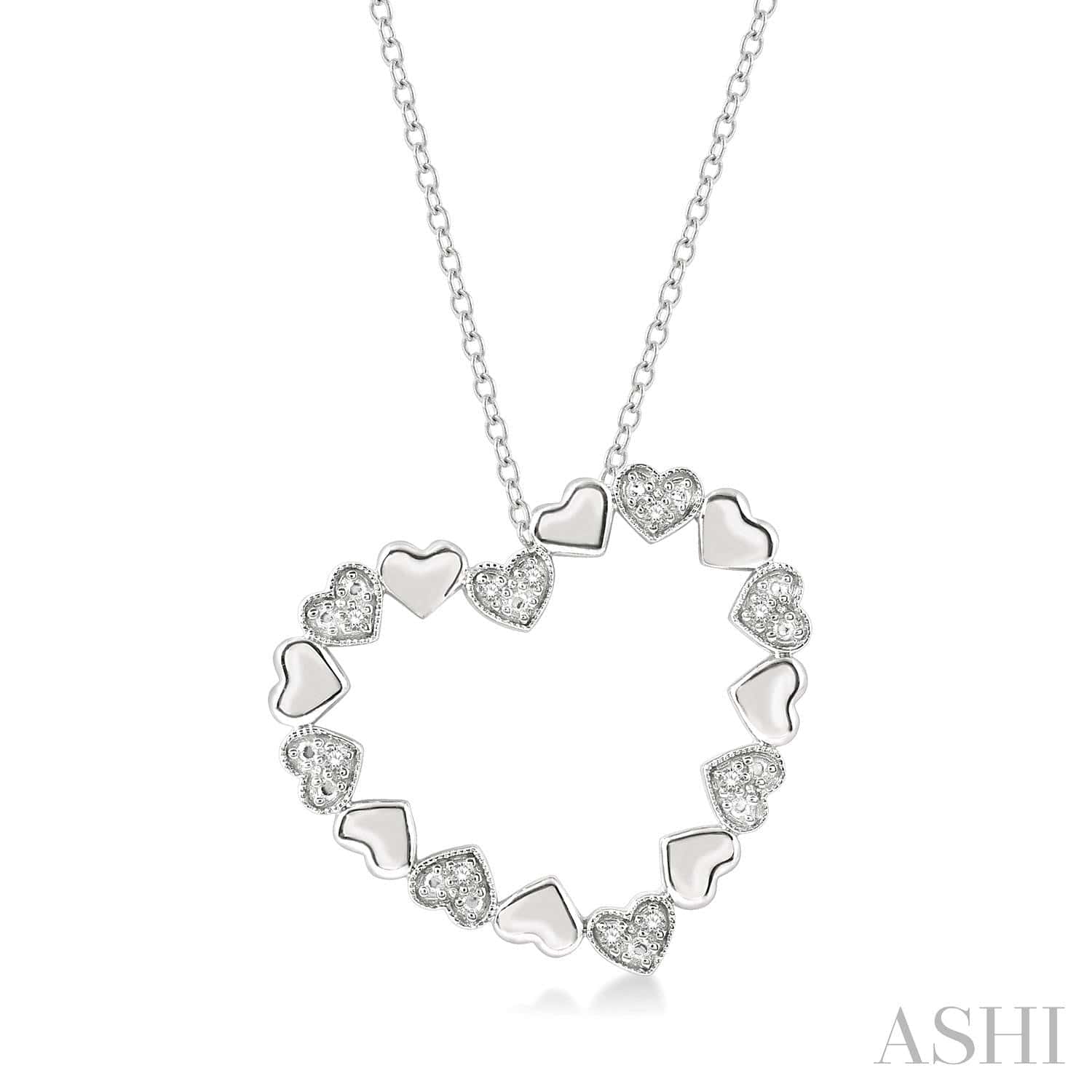 An affordable heart fashion pendant in silver that you can buy for yourself or as a gift for someone. Charming and attractively styled, the pendant draws instant attention. It features a heart shape frame, created by tiny puffed hearts that link together in a heart shape. While one heart is in plain gold, the other is embellished with diamonds, both placed such that they alternate each other. One each pave set round cut diamond adorns the diamond hearts, total 10, while a milgrain border offers a finishing touch to them. A 1MM cable chain carries the pendant, both of which are styled in silver. Total diamond weight is 1/20 ctw.