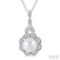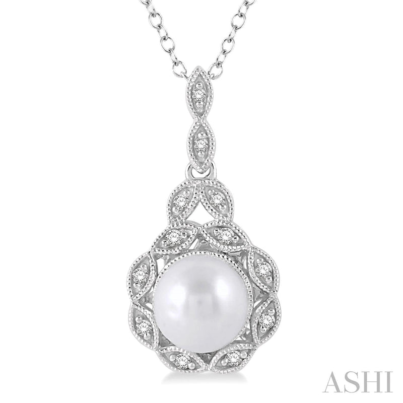 Allure your loved ones with this cultured Pearl and diamond pendant. Fashioned in luminous sterling silver this pendant showcases a centrally staged enthralling fresh water cultured Pearl elegantly complemented by 12 sparkling single cut diamonds in prong setting and dangles from a shimmering cable chain. Total diamond weight is 1/20 ctw and cultured Pearl measures 6.5 mm.